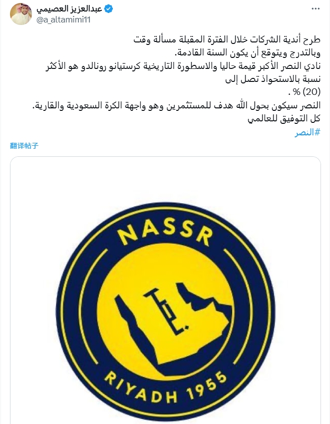 利雅得胜利目前是最有价值的俱乐部,罗纳尔多目前的股权比率最高,达到20。利雅得胜利将成为投资者的焦点,并成为沙特和亚洲足球的外墙。